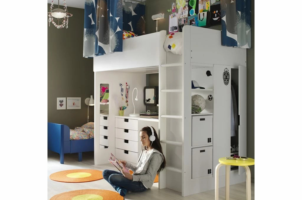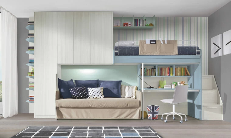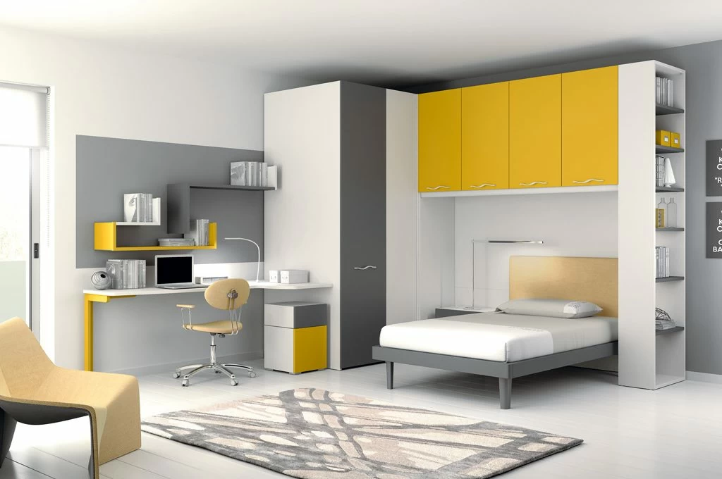 Mobilier : dormitor modular cu pat pe podea, dulap și birou