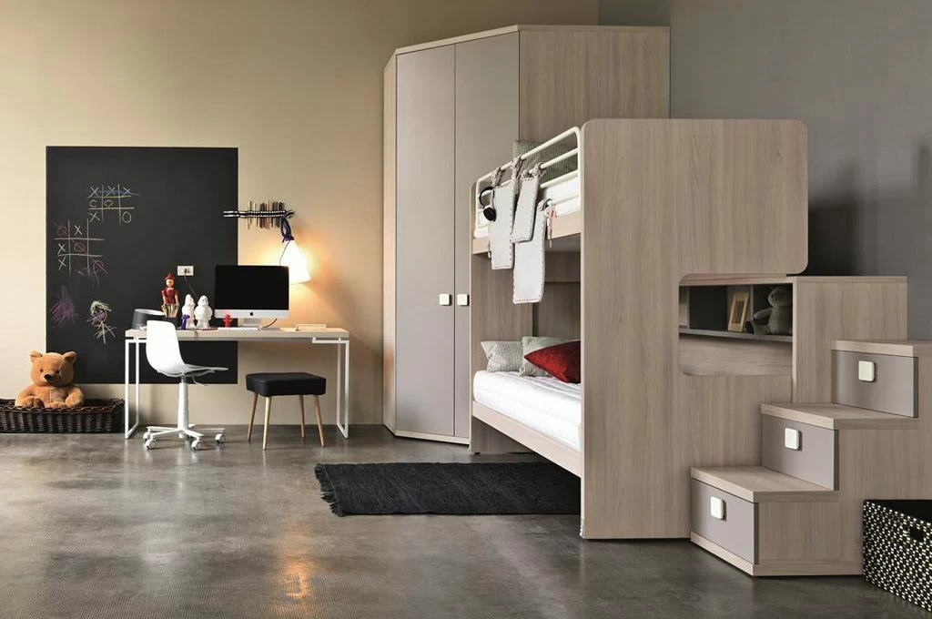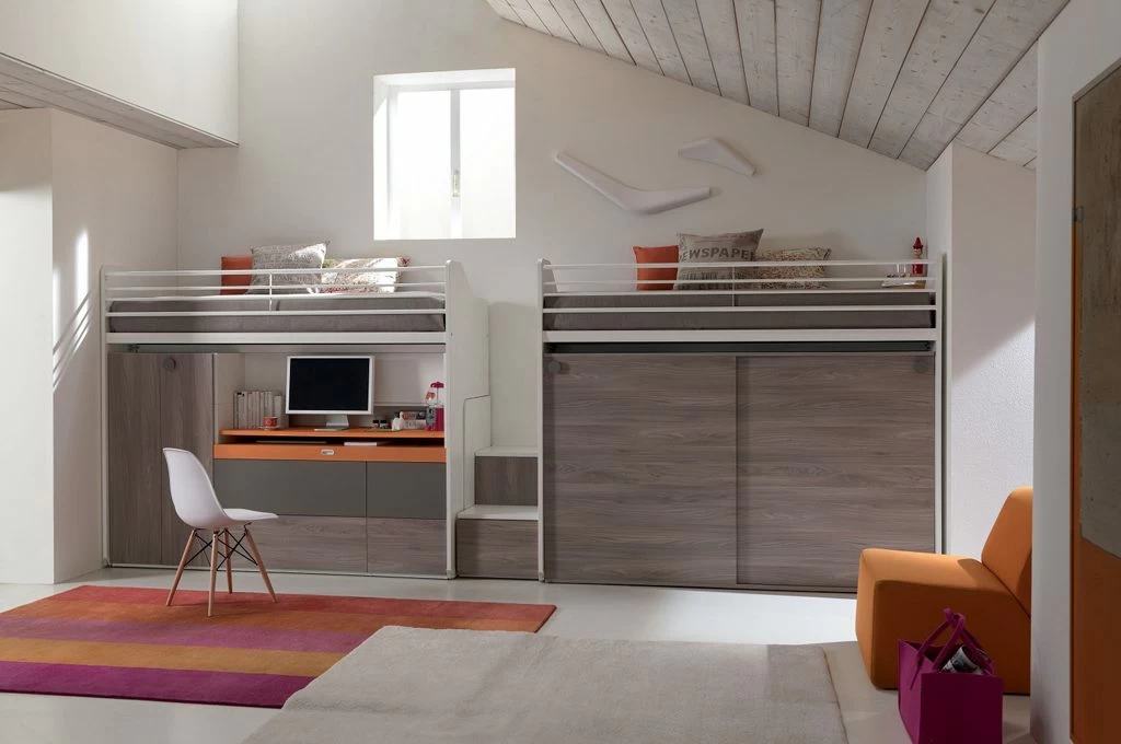 Puterea acestui dormitor sunt dimensiunile sale: 390 cm sunt tot ceea ce este necesar pentru a introduce un dulap tip pod, două paturi dedesubt și un birou cu scaun asortat.