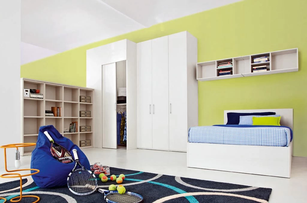 Camera ideală pentru un copil de doisprezece ani ar trebui să conțină, pe lângă un pat confortabil, un birou cu o suprafață mare de lucru și un dulap frumos .Dacă încăperea este mică, dar ai dori să integrezi un spațiu pentru cărți, soluția este să încorporezi o bibliotecă laterală în garderobă, așa cum vezi în imagine.