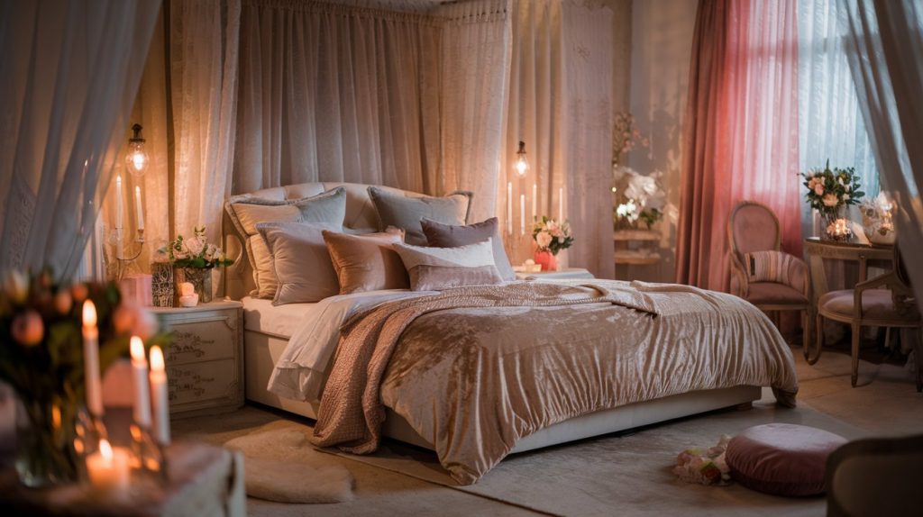 Textilele joacă un rol definitoriu în amenajarea dormitorului matrimonial, contribuind la senzația de căldură și confort. Lenjeriile din materiale naturale precum bumbacul satinat, inul sau mătasea sunt nu doar plăcute la atingere, ci și prietenoase cu pielea, favorizând un somn odihnitor. Alegeți culori și modele care se potrivesc cu restul decorului și care accentuează atmosfera romantică.